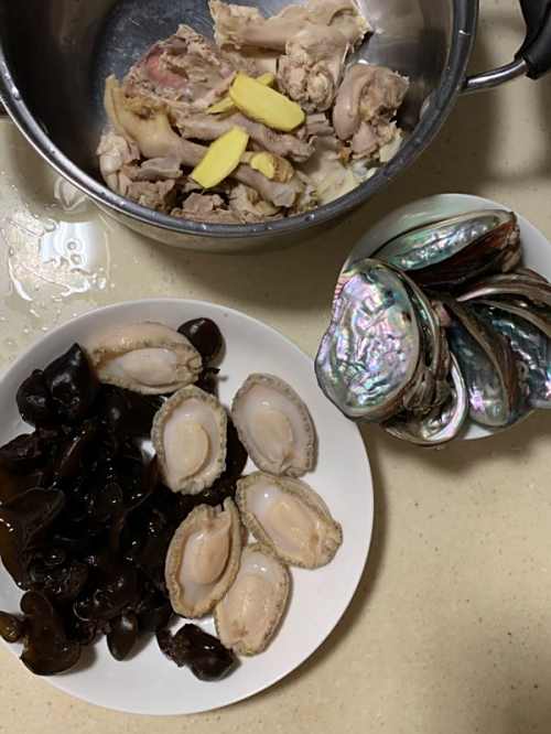 2黑木耳提前泡发,老母鸡焯水,鲍鱼鲍鱼壳刷洗干净,姜片。