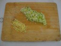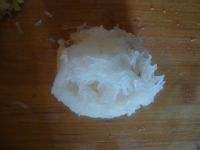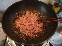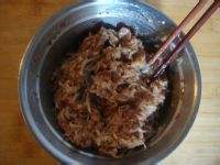 将切好的肉泥、生姜末,放入凉后的葱花油内,调入适量花椒油,鸡精,盐,顺一个方向进行搅打。