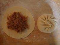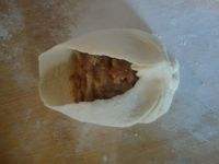 用擀面杖将小剂子擀成中间稍厚边缘稍薄的包子皮,包入牛肉萝卜馅。