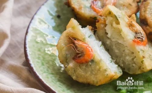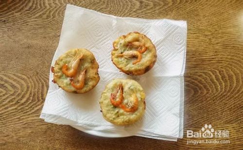 在模具底部留一点油,然后在底部倒一点面糊,然后放入萝卜丝,再在顶部倒上糊状物,在表面放两个小虾。(模具底部留有少许油,方便脱模)