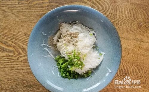 滤去盐水,加入三分之一的葱、少许盐、白胡椒和芝麻油,拌匀。