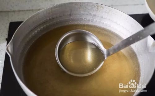 把面糊模放进油底壳里加热。(这一步是把萝卜蛋糕脱模。一般来说,街上的萝卜糕点摊上都有一个特别的小模具,但有时你不需要在家里买。家里的不锈钢勺子可以用来做任何事情。我用的勺子有点深。不要在上面涂太多面糊。)