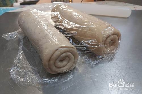 把面团分成两份,轻轻拍打排气后,盖上保鲜膜松弛20分钟。