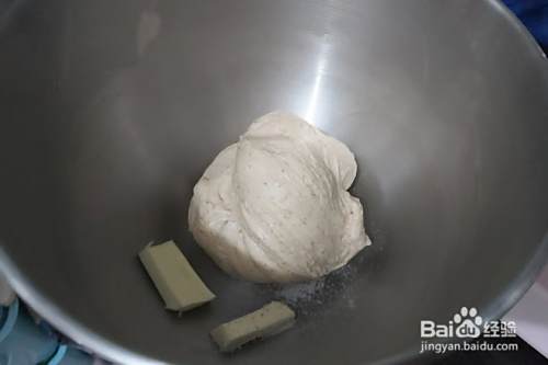 然后加入软化好的黄油跟玫瑰海盐,没有海盐可以加一点点食盐,再次启动厨师机,2档10分钟后换成3档5分钟。