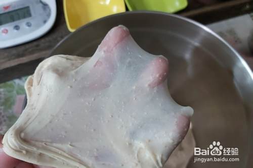 取出揉好的面团,表面油亮,轻轻扯出的膜够结实有韧性,不容易破,面团就可以了