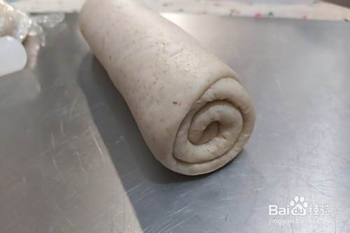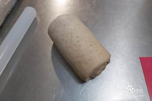 另一块面团也同样方法擀长,翻面,整理,从上而下卷起来。