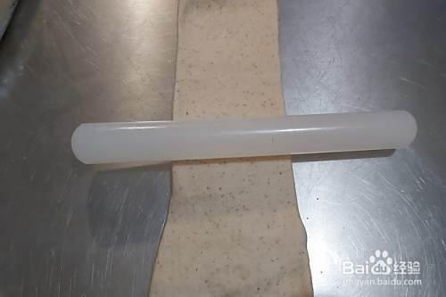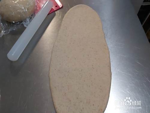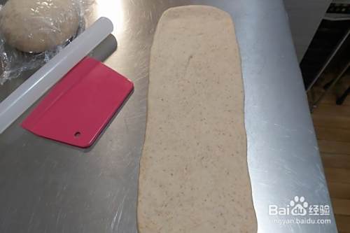 取出一块面团简单整理成一个长椭圆形,擀长,若发现有气泡直接拍掉