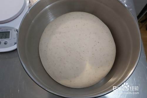 当面团发至约两倍大后发酵完成。(用一根手指沾少许面粉插一个洞,孔洞周围没有回缩,面团就是发酵完成了)