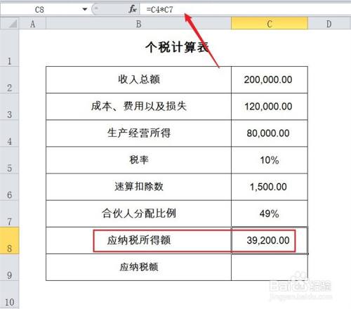 计算该合伙人应纳税额,输入以下公式,计算完毕:
