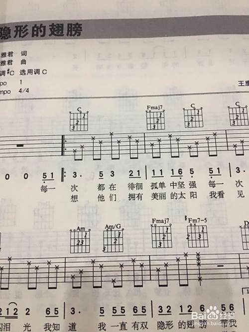 然后我们可以弹唱了。谱子上面是应该按的和弦,下面是按住和弦后应该弹的弦。最上面是1弦最下面试6弦,X写在哪根弦上就表示弹哪根弦。