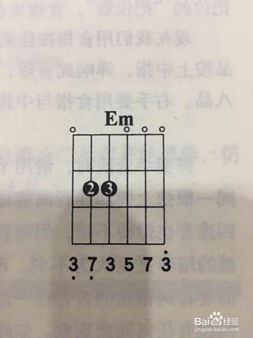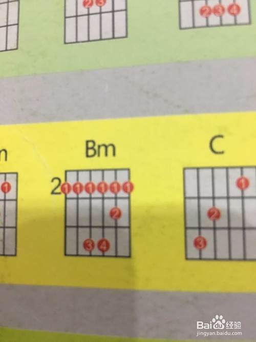 然后我们来学看和弦图。从左到右竖着的六根线代表吉他的6-1弦,从上到下的三格代表吉他的1-3个品,如果和弦图的左边没写数字就表示从一品开始,如果写了数字例如下图Bm,就表示和弦图上为2、3、4品。然后按照坐标的方法去找应该按的位置,如Em和弦应该按住5弦2品和4弦2品。所有标明要按的地方,应该使用阿拉伯数字代表的手指分别同时按住。1代表食指,2代表中指,3代表无名指,4是小指,5是大拇指。例如Em和弦应该用中指按住5弦2品,无名指按住4弦2品,两个地方同时按住,要注意按好后吉他的六根弦都能正常发音。
