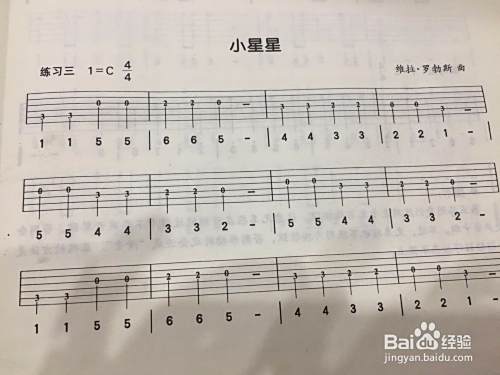 然后我们来进行一组单音练习。单音的谱子六根线条,最上面一根即为我们吉他上的1弦,最下面则是6弦。谱子上的阿拉伯数字写在哪根线上,则表示我们要按和要弹的是哪根弦,阿拉伯数字是几,就表明我们要按在极品上。如下面这首小星星,第一个音表示按住5弦的三品,用大拇指往下拨5弦。按弦的时候凡是一品用食指按,二品用中指,三品用无名指,四品用小指。
