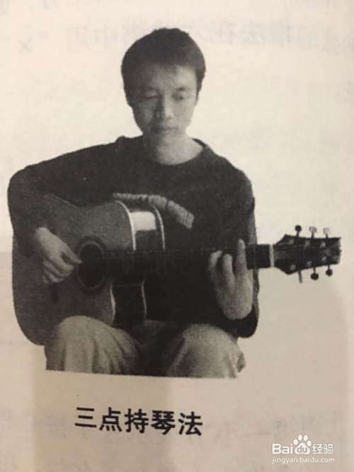 现在我们来学习正确的弹奏姿势。其要点有三:第一,正常情况我们弹奏吉他是左手在指板上按弦,右手在音孔中间弹拨琴弦,所以琴头应该是在我们的左手边(左撇子除外),琴箱在我们的右手边。第二,琴箱下面侧板上凹进去的弧形段放置在我们的右腿上。第三,琴的背板轻触我们的前胸。第四,我们的右臂肘关节放置在琴箱的上面侧板上。