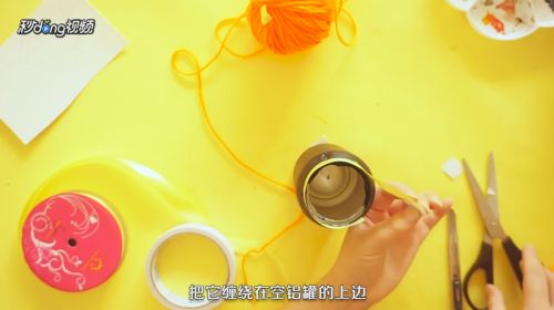 2找一个空铝罐,在边上打四个洞。给空铝罐涂上颜色,剪一截金色丝带,在丝带上每间隔一段距离粘一块双面胶。