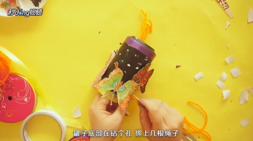 4用双面胶粘在铝罐上,以同样的方法做上几个不一样的蝴蝶,也可以用颜料给铝罐上画一些图案。