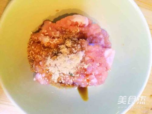 猪肉切成馅,加入生抽一勺,白胡椒粉一小勺,鸡精一小勺,白砂糖一勺,香油两滴,搅拌均匀,腌制五分钟。