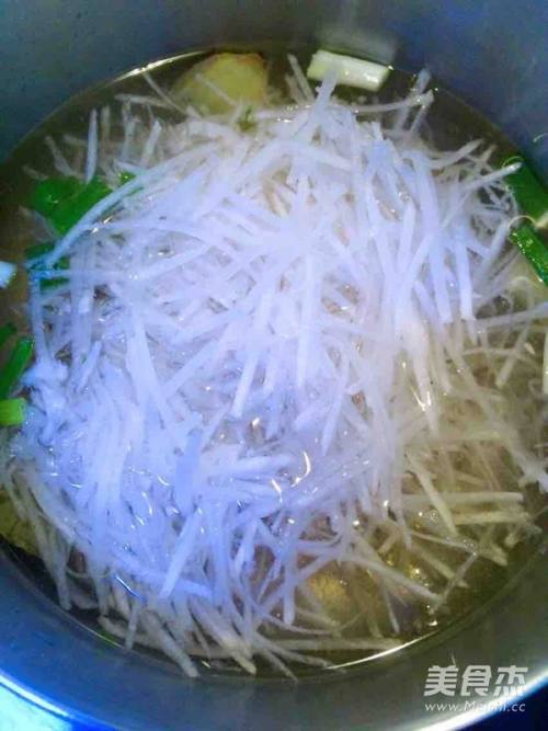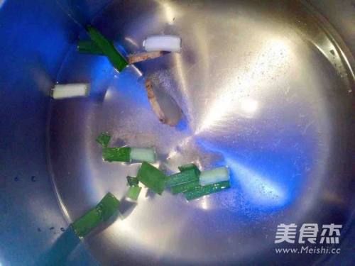 锅中倒水,加入精盐两勺,葱花,姜片,烧开。
