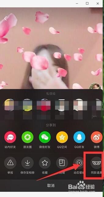 找到自己想要使用相同道具的视频,点击右边“分享”按钮。