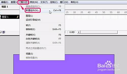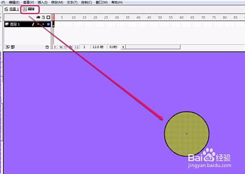 在第5帧插入关键帧,将“扁球”组件导入进来,并且摆放“扁球”在运动轨迹的底部,球的中心点要和轨迹重合。