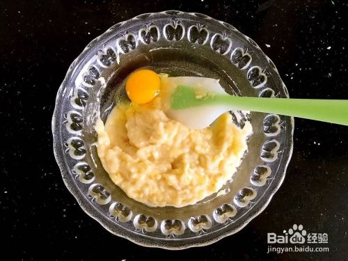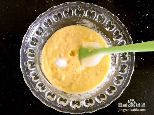 香蕉用硅胶铲碾压成泥,打入鸡蛋搅拌均匀。