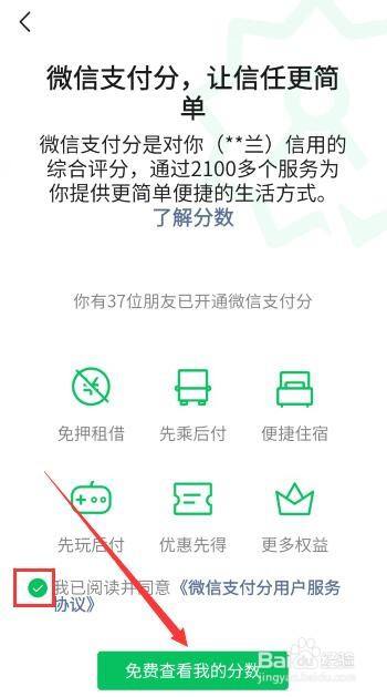 勾选【条款】后,点击【免费查看我的分数】即可查看到支付分了。