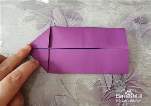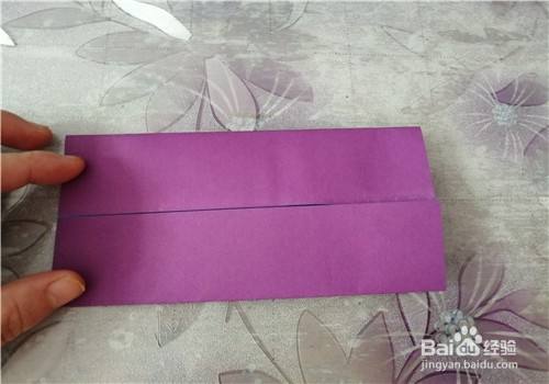 首先把彩纸的中线对折,如图一。再把上下边向内折,如图二。把左侧的角向内折,如图三。