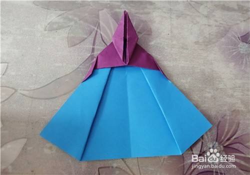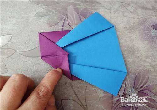 我们把中间部位的两个角分别向内折,如图一。把彩纸转一下,再把上面的角向上拉开,如图二。然后把彩纸从中间对折,如图三。