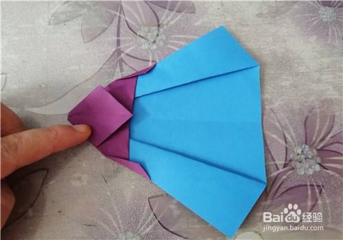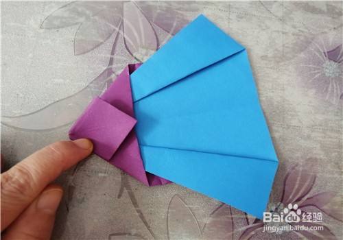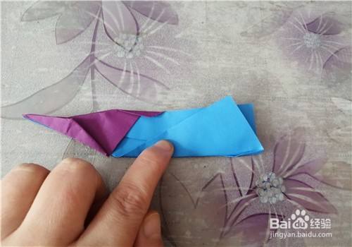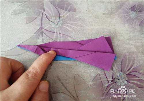 我们把下面的角上折,并把角从里边向上折,再把两侧的边平折,如图所示。
