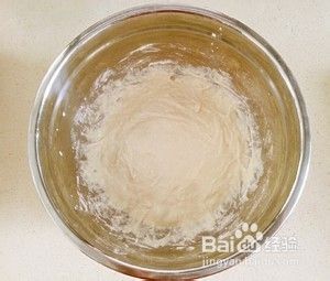 我们用水将酵母融化,静止6分钟左右。然后我们把面粉倒进去,顺着一个方向搅拌,当你看到面粉没有粘块的时候就可以了。