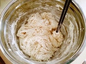 这个时候再拿一点面粉撒到盆里,用筷子搅拌成絮状。