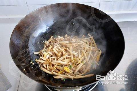 将洗净的黄花菜倒入,跟肉丝一起翻炒,放适量盐调味后加适量水,盖上锅盖3分钟,让黄花菜进味儿。