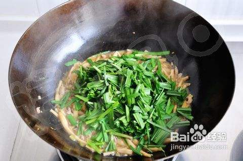 最后放入切好的韭菜段儿,翻炒出锅。韭菜在这道菜里不仅颜色好看,韭菜特殊的香味也是这道菜是否好吃的关键,因为大家都知道的,黄花菜有淡淡苦味,放点韭菜就变得很鲜啦~~