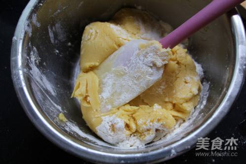 5筛入面粉和小苏打,中式的点心用我们中式的普通面粉就可以了。粉类一定要过下筛。