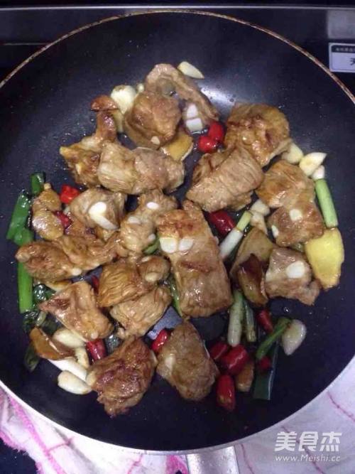 下入,过热水洗净控干的排骨,煸炒排骨的水分,