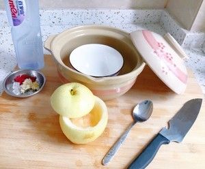 材料:水晶梨一个、冰糖一个梨用5、6粒就够了、陈皮1小块、枸杞少许点缀用
