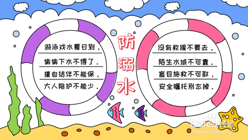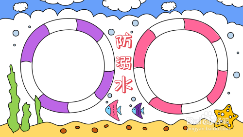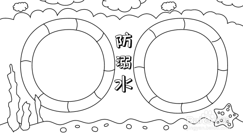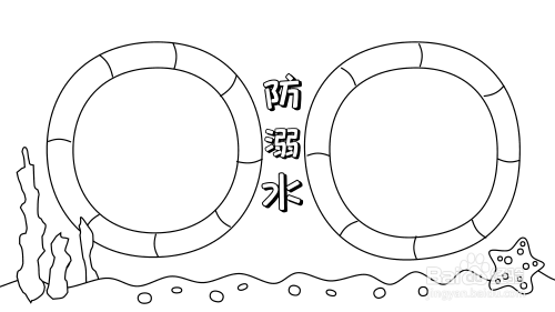 在白纸中央写上“防溺水”三个大字。两边画上两个游泳圈。