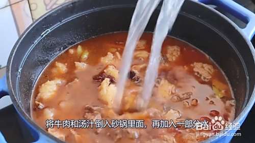 倒入一半去皮的西红柿块翻炒,加入生抽、老抽继续翻炒,炒到西红柿出汁之后倒入开水,将牛肉和汤汁倒入砂锅里面,再加入一部分水,盖上盖子煮40分钟。