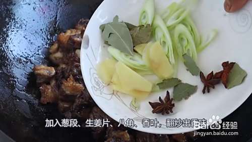 锅里倒油,转小火,放入冰糖炒成枣红色,放入牛肉翻炒均匀上色,淋上料酒翻炒几下,加入葱段、生姜片、八角、香叶,翻炒出香味。