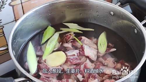 切块的牛肉放入锅中,加入葱段、生姜片、料酒焯水焯好水之后,把牛肉捞出来放入盆中,用温热水冲洗几遍备用。