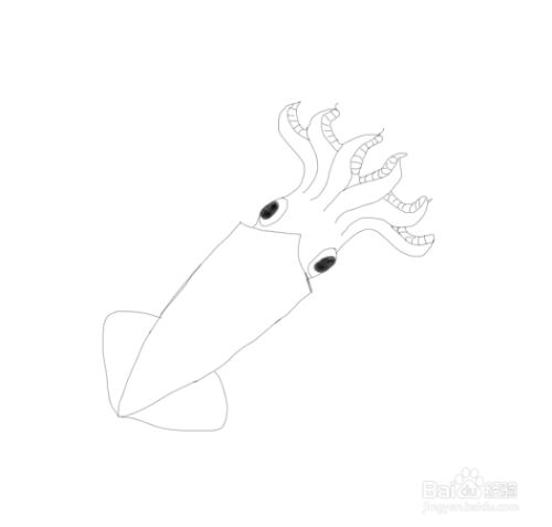 再在鱿鱼身体和眼睛的基础上再画出鱿鱼的头部的触角,如图所示: