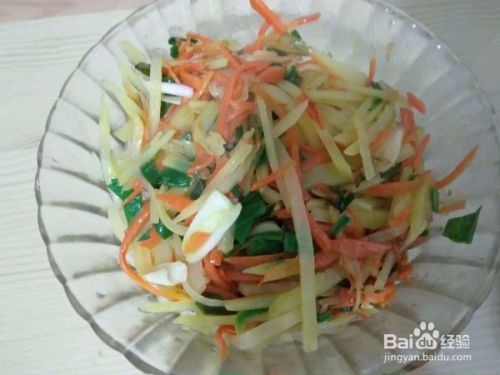 出锅把菜盛入碗中,一道色香味俱全的胡萝卜土豆丝就做好了。喜欢吃鸡精的可以出锅前放点进去。