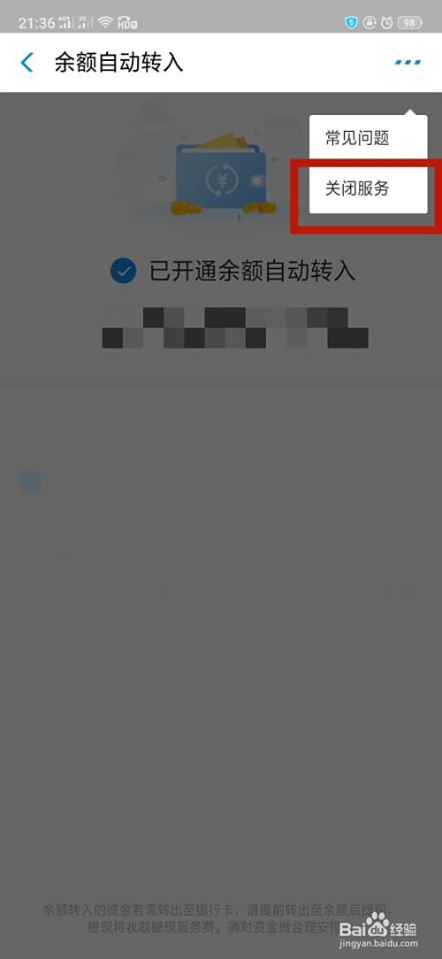 2、点击“余额自动转入”在右上角更多处选择“关闭服务”即可。