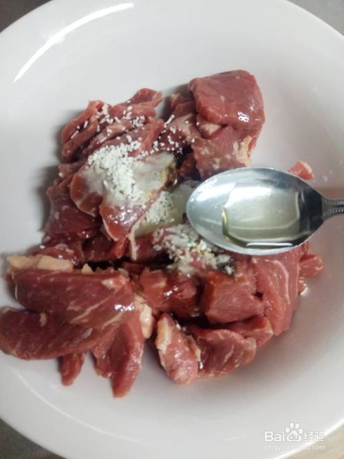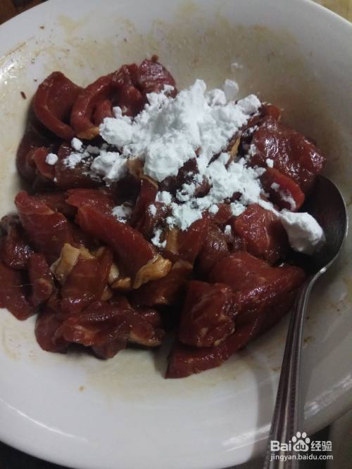放置15分钟后,往牛肉中放入一勺淀粉,然后抓匀。