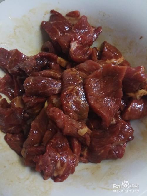 切好的牛肉放入碗中,然后放入一勺油,少量鸡精,两勺料酒,酱油一勺,五香粉少量,然后搅拌均匀。放置15分钟。