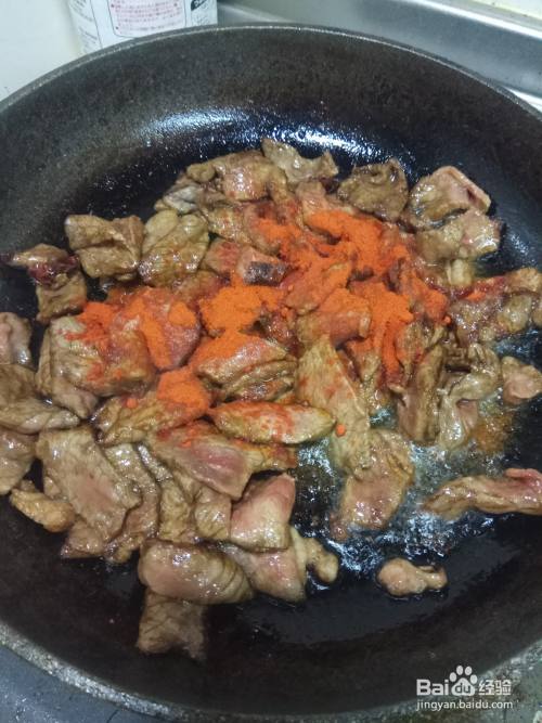 牛肉翻炒变色之后,放入适量的辣椒面进行翻炒。