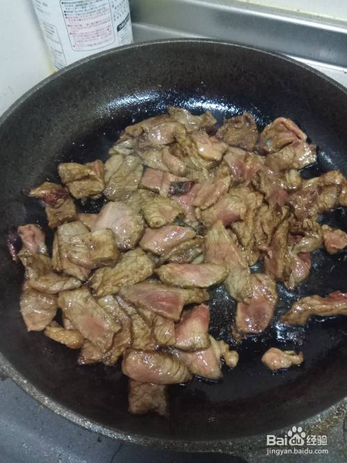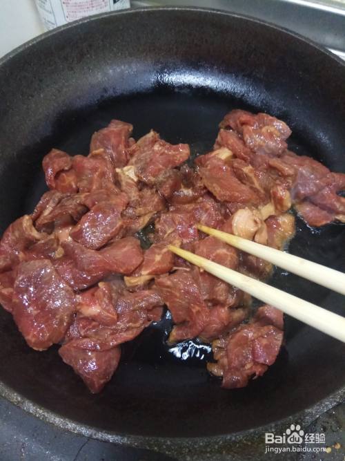 爆香后,放入腌制好的牛肉,快速翻炒。