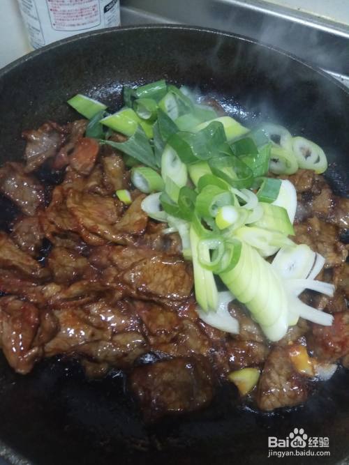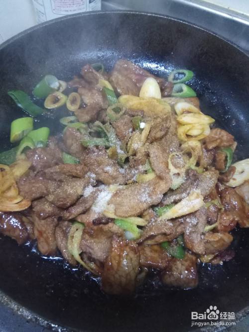 翻炒一分钟后放入切好的葱丝,翻炒均匀之后再放入两勺孜然粉和适量的食盐。