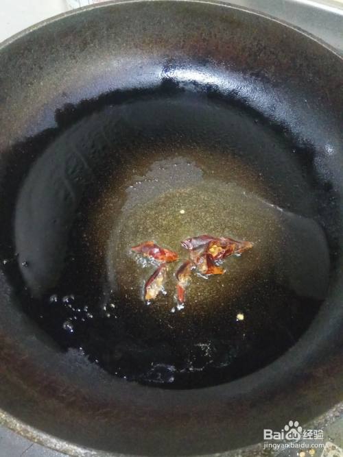 取一个炒锅,然后放入适量油,油热后放入干辣椒小段爆香。