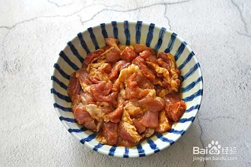 将瘦猪肉放入老抽、1茶匙生抽、淀粉,抓匀后腌制10分钟。