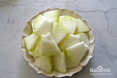 将冬瓜削去青衣和瓜瓤后,切成片,是薄是厚自己随意,厚的话口感好,但是要多炖一会儿。